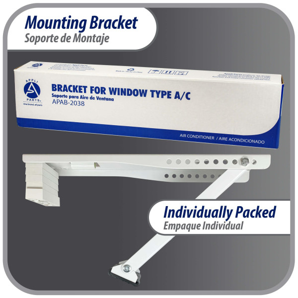Appli Parts Window air conditioner bracket for Units Up To 85 lbs heavy duty powder coated finish mount for extra durability with installation hardware included and mounting parts APAB-2038 Universal: This ac support bracket has several installation settings for multiple equipment size and shapes. The position, height and angle can be adjusted to different positions according to the unit Protects: When installing our window unit with a specified support bracket your Investment is protected form Weather Related Debris and Unwanted Visitors (Vandalism) Includes Installation Hardware: Brackets with integrated level, Rubber Pads for exterior wall support , Screws and Expanders for different window base materials, Bolts and Nuts for bracket stability Durability: Made of Powder Coated Steel to Withstand Extreme Weather conditions. Will support Ac units typically up to 10,000btu/hr with a maximum weight of 85lbs Confirm that the dimensions and other attributes of the product closely match those of the original item being replaced
