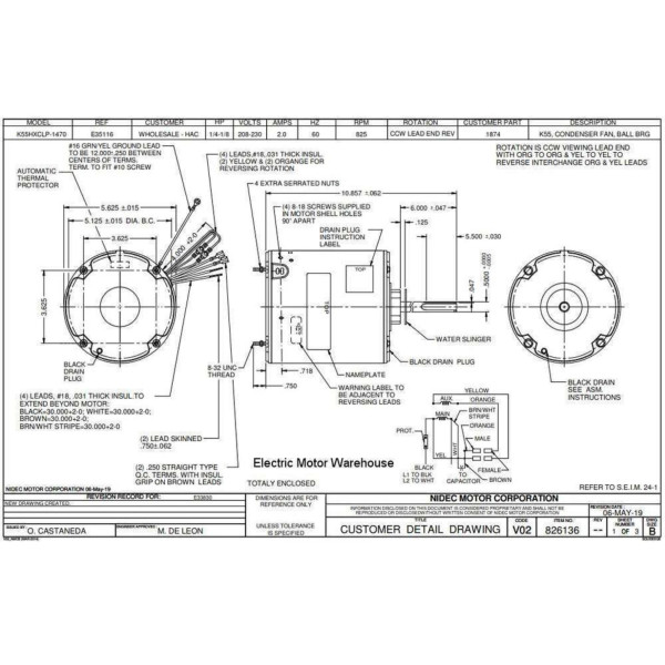 US Motors 1874 1/4-1/8 hp 825 rpm, 8 poles, 1 shaft, TEAO Enclosure, 1 speed, 5.5 diameter, CCW, Lead End, Reversible, 208-230 V, 60 hz, 1 ph, 5 mfd/370 VAC Run Capacitor K055CLP1470012B