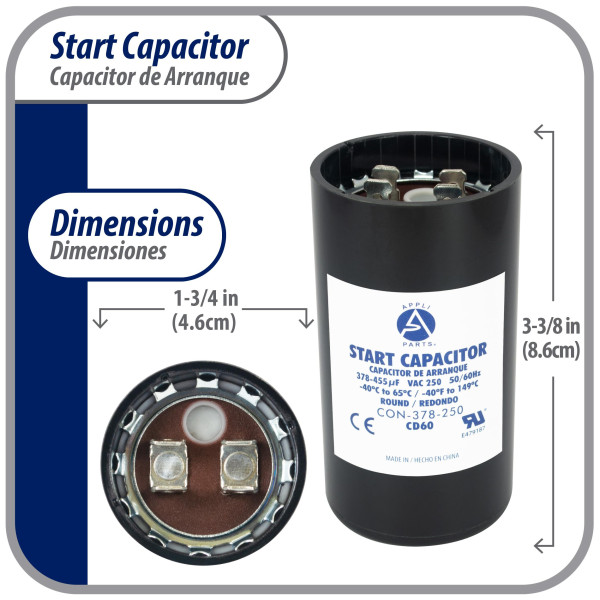 Appli Parts CON-378-250 Capacitor de Arranque 378-455 MFD (microfaradios) uF, 250 VAC. Universal para Motores Electricos, condensador de arranque de 4.6 cm de Diametro, 8.6 cm de Alto Compatibilidad Universal: Funciona como reemplazo de cualquier marca con la misma capacidad en microfaradios y el mismo voltaje. Disenado para 250 VAC con terminales macho de 1/4 de pulgada. Reemplaza 2MEU4 CAP-378-250 Certificado: Un capacitor tipo CD60 es un capacitor de arranque de motor monofasico, de tipo electrolitico, no polarizado, de alta capacitancia y uso intermitente, disenado para proporcionar un alto par de arranque durante unos segundos al encender el motor. Construccion de Alta Calidad: Fabricado bajo certificacion UL E479187, tipo CD60, libre de PCB para un uso seguro y confiable. Elaborado con materiales resistentes para mayor durabilidad y larga vida util. Especificaciones Tecnicas: Tolerancia de +/-20% de su capacidad nominal. Rango de temperatura de trabajo desde -40C hasta 65C. Frecuencia 50/60 Hz. Dimensiones 4.6 cm de Diametro, 8.6 cm de alto Aplicaciones: Ideal para circuitos de arranque de motores electricos en bombas de agua, bombas de alberca, sierras de mesa, compresores y otras aplicaciones generales. Verifique que las dimensiones y caracteristicas sean similares al producto que esta reemplazando.